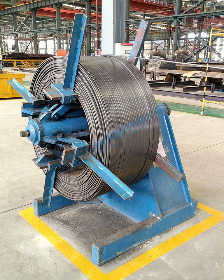 將成盤(卷)的扁鋼帶送至扁鋼精整機內,實現“放線”作業的專用設備。